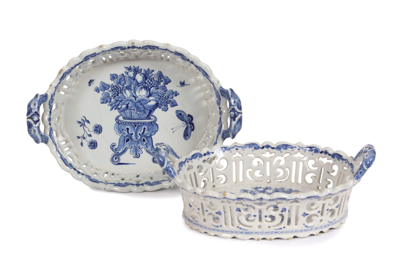 Each finely painted with an elaborate central scene depicting a basket brimming with fruit, resting on an ornate baroque table and surrounded by delicately rendered insects and butterflies, the pierced sides highlighted in cobalt blue, the handles molded in the form of interlocking dolphins, the upper rim featuring a scrollwork band both on the exterior and the interior, the lower exterior decorated with a geometrical band of squares and triangles with stripes in the middle.