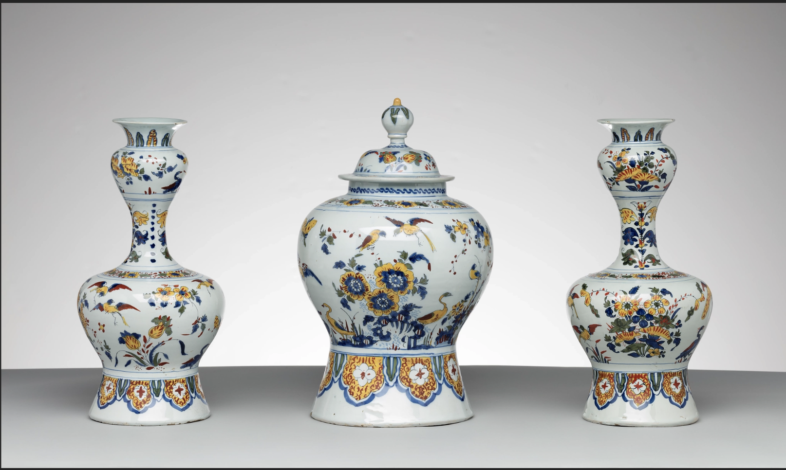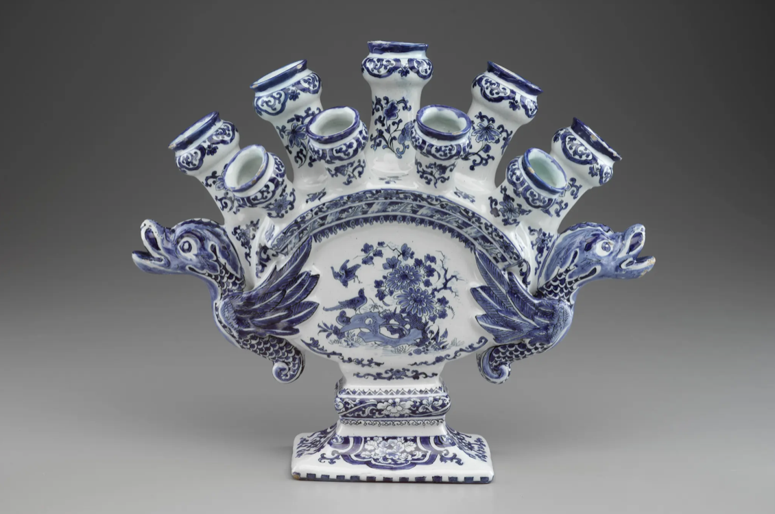 A particularly notable piece is the garniture of three vases (ca. 1690) from De Paauw (The Peacock) factory, produced under the direction of Petronella van Dijssel. Decorated with stylized flora, insects, and birds, this set exemplifies Delft potters’ adaptation of imported Chinese porcelain designs to European tastes. Another highlight, a flower vase attributed to De Grieksche A (The Greek A) factory and possibly made by Adrianus Kocx, demonstrates the specialized forms developed for displaying tulips and other luxury blooms during the Dutch Golden Age.