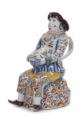 Similar Examples: A blue and white basket of this type dated on the base Anno 1675, similarly decorated with a flower-filled vase, but the pierced sides applied only with flowering vines, is in the Gemeentemuseum, The Hague, and illustrated by Van Aken-Fehmers 1999, pp. 226, 237 and 238, no. 81, who suggests that the form was derived from a slightly earlier silver bread basket. The same basket is illustrated in Charleston, Lunsingh Scheurleer 1979, monochrome pl. 77; in Lunsingh Scheurleer 1975, pl. 38 and Lunsingh Scheurleer 1984, p. 211, pl. 85; and in Exh. Cat Dresden 2004, p. 249, no. 162. A slightly larger but otherwise very similar basket is illustrated in Aronson 2006 Catalogue, p. 11, no. 4. A polychrome basket also of this type, probably circa 1690, but with variations in the applied decoration on the pierced sides and painted with a chinoiserie figure and dog, is in the Evenepoel Collection, no. 80, at the Musées Royaux d’Art et d’Histoire, Brussels, illustrated in Dumortier 1990, cover and pl. 21; in Fourest 1980, p. 71, pl. 59; in Helbig, Vol. II, p. 124, fig. 118; in Hudig 1929, p. 124, fig. 114; in Mariën-Dugardin 1971, pl. 147; and in Aronson 2008 Catalogue, p. 29, no. 5. A Delft small covered basket pierced on the sides with related decoration of pairs of cherubs or cupids supporting a flaming heart, is in the Museum für Kunst und Gewerbe, Hamburg, illustrated by Bauer 1989, p. 51, no. 39, who ascribes it a date of circa 1650-70, and who also illustrates on p. 66, no. 52, a reticulated circular basket closer in form to the present example, though pierced on the sides with scrolling foliate vines and dated on the base Anno 1670. A further example of that type, dated 1675 and with a central flower-filled vase, is illustrated in Van Aken- Fehmers 1999, pp. 226 and 237, no. 81.