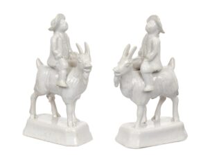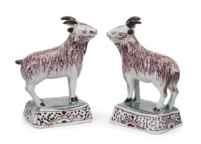 Both modeled as a blue bearded Chinese figure, wearing a manganese robe and yellow shoes, seated in front of a recumbent deer with one foreleg extended on a green grassy base painted with flowers and floral sprigs, underneath a tree trunk with a bird perched on a branch eating a yellow and iron-red colored fruit, surmounted by a manganese candleholder on a foot of leaves.