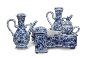 Similar examples: A toiletry or sewing basket of similar shape and size is illustrated in Aronson 2010, p. 157, no. 93. A comparable basket with a biblical decoration in the Gemeentemuseum, The Hague, is illustrated in Lunsing Scheurleer 1984, p. 211. ill. 84. Another blue and white 1694 dated basket of the same shape, but with pierced openwork, is in the collection of the Rijksmuseum, Amsterdam (inv. no. BK-NM-12400-102). Also in the Rijksmuseum, Amsterdam is a pair of blue and white 1740 dated baskets of comparable shape, but with pierced openwork and painted on the bottom with a comb, a bodkin, a small box and a pincushion (inv. no. BK-NM-12400-100).