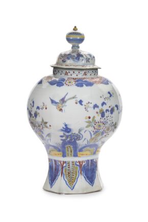 A similarly marked and decorated small teapot in the Vromen Collection is illustrated by Boyazoglu, De Neuville 1983, p. 90, no. 109; in Van Dam 2004, p. 119, no. 69; and in Vrienden van de Nederlandse Ceramiek 48, ill. 15. Other marked examples with differing floral decoration are illustrated in De Jonge 1965, p. 215, ill. 125; and De Jonge 1970, p. 90, ill. 86; in Fourest 1980, p. 106, no. 99; in Helbig, vol. I, p. 39, g. 15; in Lunsingh Scheurleer 1984, p. 312, no. 351; and in Mees 1997, p. 112, Boijmans van Beuningen museum, Rotterdam (inv. no. A 4330), where it is referred to as an ‘infusion pot’. A ‘Black Delft’ tasting pot similar to the present example in its small size, 7.5 (3 in.) high, is illustrated in Aronson 2010, p. 87, no. 46.