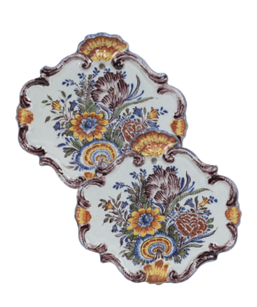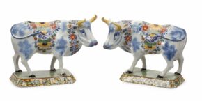 This ornamental object is modeled in the shape of an ice sleigh of the type that provided a lady with a comfortable pleasure ride on the ice, while propelled by a skating gentleman. An example of this shape can be seen on a penny print illustrated in Aronson 2009, p. 89, and two simplified examples are illustrated on a blue and white plaque depicting a winter canal scene, illustrated in Aronson 2010, p. 111, no. 61. Although Delftware models of sleighs were being made by the late seventeenth and early eighteenth centuries, this type with floral patterns is dated stylistically to the second half of the eighteenth century (for examples dated 1732, see Van Aken-Fehmers 1999, p. 255, no. 97; and Helbig, Vol. II, p. 30, ill. 16).