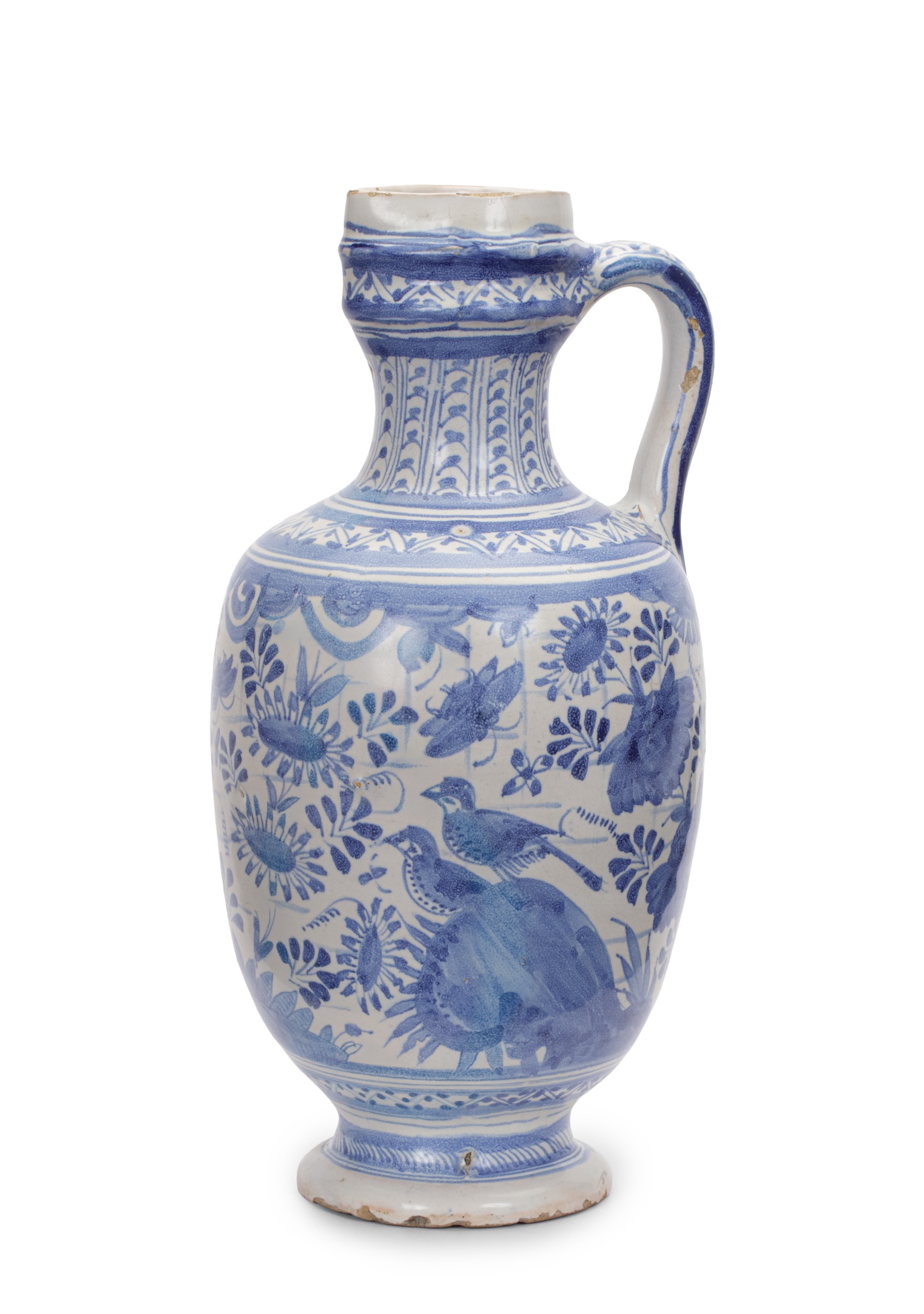 This type of Delftware jug belongs to the first generation of blue-and-white wares that entered Dutch homes in the mid-seventeenth century and soon appeared in contemporary painting. These early examples mark the moment when Delft potters successfully adapted Chinese porcelain models to local taste, creating objects that reflected both global exchange and Dutch domestic refinement. Dutch artists of the seventeenth century were quick to recognize the visual and symbolic appeal of such Delftware. Willem Kalf (1619–1693) used comparable vessels to heighten the sense of luxury in his still lifes, while Jan Steen (1626–1679) placed them in lively scenes of daily life. In Girl Eating Oysters (c. 1658–60, Mauritshuis, inv. no. 818), a flirtatious diner sits beside a blue and white jug, and in The Doctor’s Visit (c. 1665–68, Mauritshuis, inv. no. 168), a maid holds a similar vessel in a humorous depiction of love-sickness. Steen’s repeated inclusion of the form suggests that such jugs served as studio props, reflecting how familiar Delftware had become in mid-seventeenth-century interiors. These jugs are traditionally linked to the Delft factory De Porceleyne Schotel (The Porcelain Dish), whose painters favored Chinese-inspired motifs, flowers, birds, and rockwork, interpreted with a lively and expressive Delft hand. Their presence extended beyond Steen’s domestic scenes: a related example appears in Laurens Craen’s Still Life with a Lobster and Delft Jug (Christie’s Amsterdam, 7 November 2001, lot 77). Viewed in this wider visual context, the present jug bridges domestic use and artistic representation, capturing an early moment when Delftware both emulated Asian porcelains and established a visible, even narrative, role in Dutch cultural life.