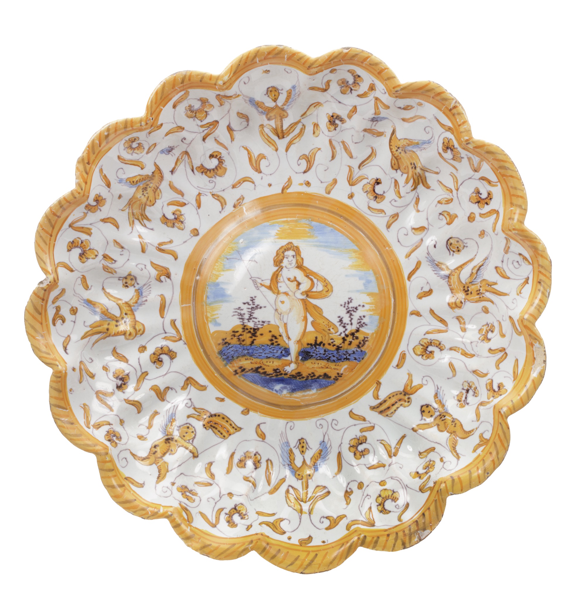 This large scalloped crespina is painted in the tradition known as Grotesques à la Patanazzi, named for the refined maiolica dishes produced by the Patanazzi family in Urbino around 1515. The decoration reflects the enduring influence of Italian Renaissance grotesques, with fantastical winged figures, birds, scrolling foliage, and hybrid creatures arranged in a rhythmic pattern. At the center, within concentric ochre borders, stands a cherub wearing only a sash and holding a cross, set against a stylized landscape in ochre, manganese, and blue. The broad, undulating rim is painted with radiating ochre stripes, framing the lively ornamental field. By around 1600, Haarlem had become a leading center for majolica production in the Northern Netherlands, due in part to the migration of skilled potters from Southern Europe. Archival records list some forty-five potters active in the city, though the work of only one, Willem Jansz. Verstraeten, can be securely identified. After training in Delft, Verstraeten established his own pottery in Haarlem in 1625, producing wares of exceptional quality, often inspired by Italian prototypes from Faenza, Montelupo, and Urbino. His adoption of creamy opaque tin glazes, restrained figural decoration, and technical innovations such as glazing the reverse allowed his workshop to compete directly with imported Chinese porcelain. The present large crespina, with its vibrant grotesque ornament and central classical figure, reflects both the technical skill and cosmopolitan design vocabulary of Haarlem’s majolica tradition. Combining Italianate motifs with Dutch craftsmanship, it stands as a testament to the international currents that shaped the decorative arts of the early seventeenth century.