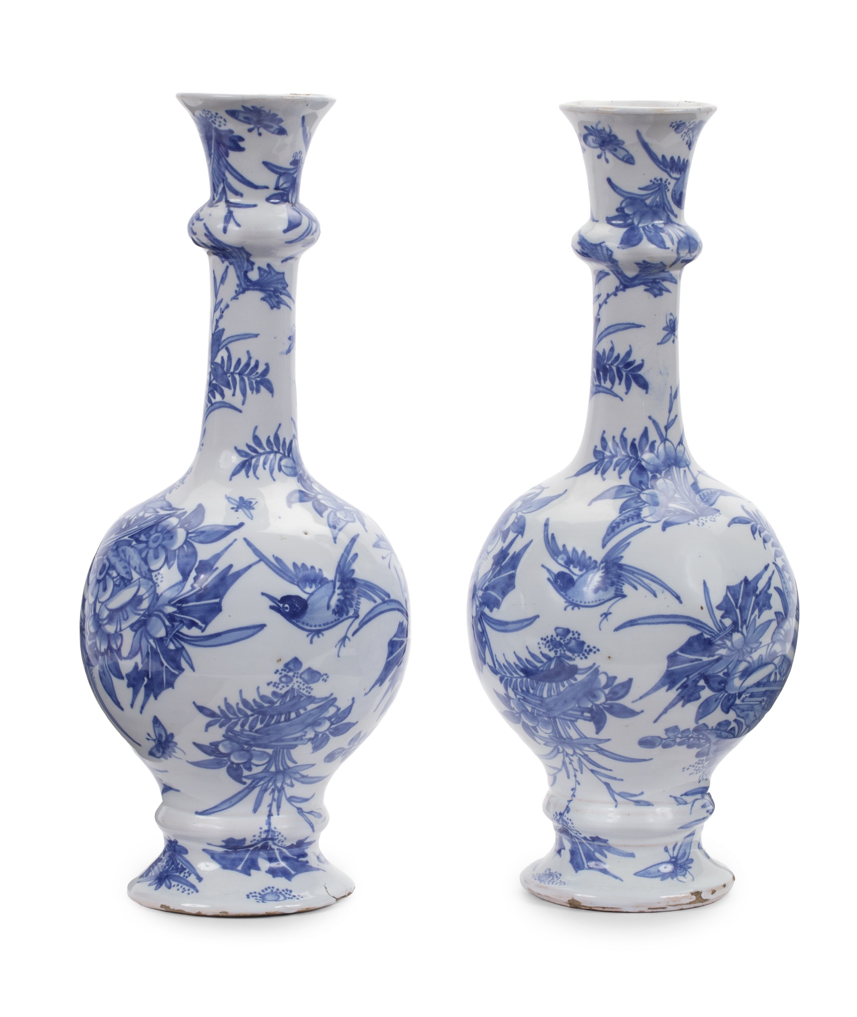 Shaped with a slender, elongated onion neck and a rounded body, this pair of bottle vases is continuously decorated with scenes derived from Chinese woodblock prints, depicting birds and insects animatedly fluttering among flowering plants. The uninterrupted pictorial surface reflects a decorative approach that privileges narrative flow over compartmentalization. For much of the twentieth century, roughly between 1920 and 1990, faience decorated in this manner was erroneously attributed to a small manufactory in Frankfurt am Main. This attribution has since been decisively overturned. Archaeological evidence, including factory waste recovered in Delft, combined with securely dated Delftware bearing identical motifs, has firmly established Delft as the center of production. Scholarly research by Dr. Van Dam and others has been particularly instrumental in this reassessment. A key comparative example in the collection of the Kunstmuseum in The Hague, dated 1661, predates the onset of faience production in Frankfurt and provides compelling chronological proof for a Delft origin. The decorative vocabulary of these vases must be understood in the context of the importation of high-quality Chinese porcelain into the Dutch Republic between circa 1630 and 1640. These so-called “transitional wares” exerted a profound influence on Delft potters. The term refers to the period of political upheaval following the death of the Wanli Emperor in 1619, culminating in the fall of the Ming dynasty and the establishment of the Qing dynasty in 1644. Unlike earlier Kraak porcelain, which was structured by radiating panels, transitional porcelain featured continuous scenes, often populated by landscapes, animals, insects, or figures engaged in quiet conversation or dynamic action. Early faience objects such as the present pair belong to a group produced in Delft between approximately 1660 and 1680, characterized by chinoiserie landscapes incorporating flora, fauna, and delicate natural motifs. On the basis of stylistic analysis, archaeological findings, and securely dated comparanda, these vases can now be confidently reattributed to Delft, correcting a long-standing misinterpretation in the scholarly literature.