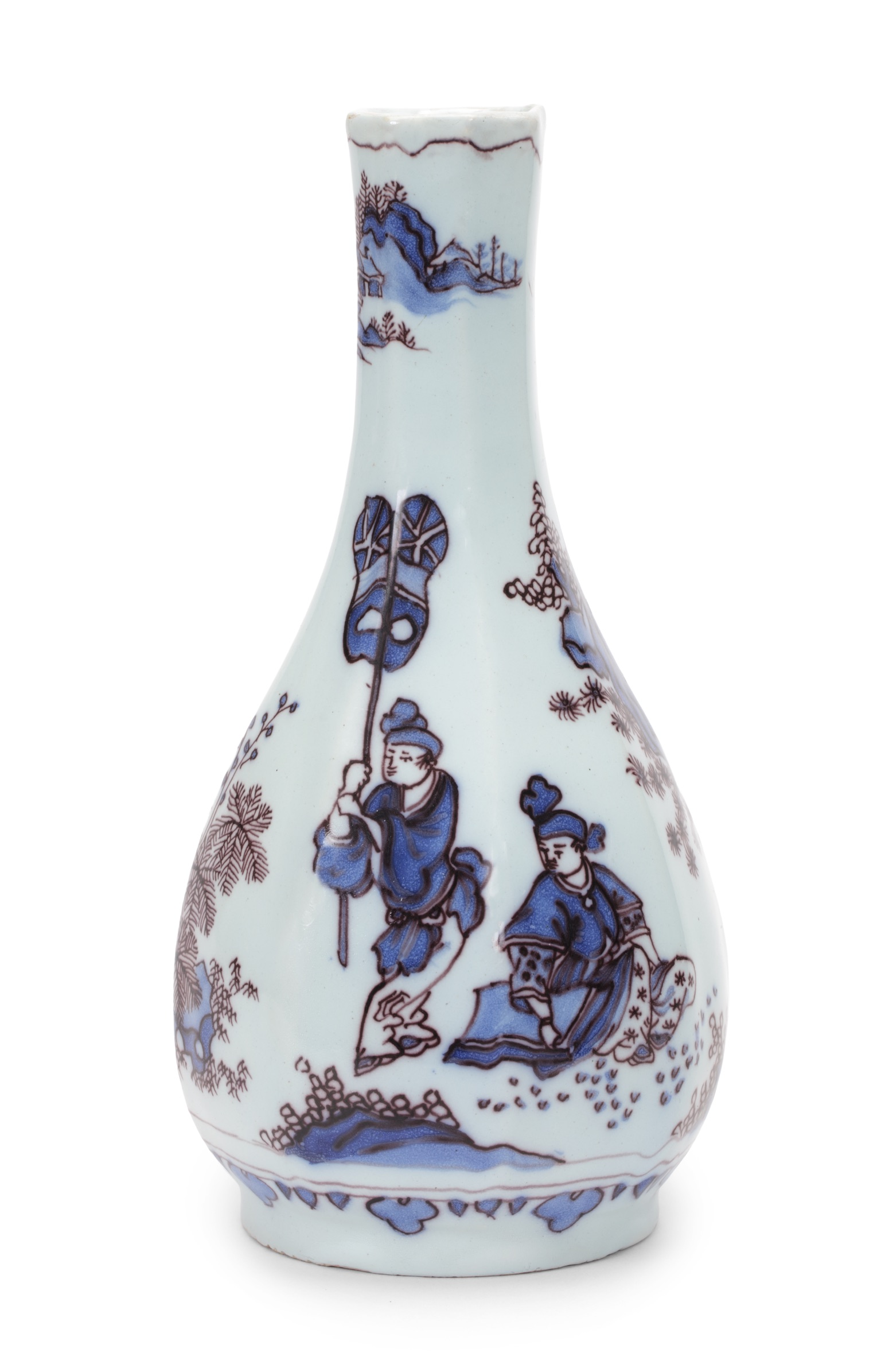 Produced under the tenure of Samuel van Eenhoorn, this vase exemplifies the hallmarks of his style: the use of trek, a fine outline in blue, manganese, or violet to accentuate figures and details, combined with a blue and manganese palette, a subtly bluish glaze, and refined chinoiserie decoration inspired by Chinese Kangxi porcelain (1662–1722). The painted scene depicts a standing servant between two seated figures in a fenced garden, and on the reverse, a seated figure with his attendant bearing a large fan.