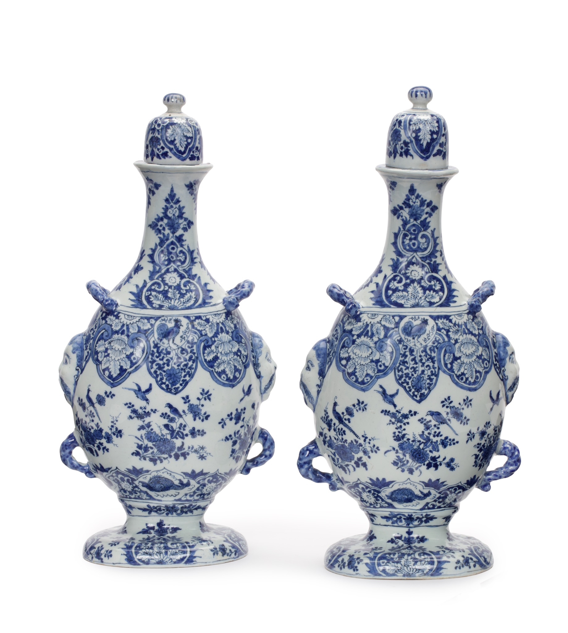 Both marked AK in blue for Adrianus Kocx, owner of De Grieksche A (The Greek A) factory from 1686 to 1701, and each further accompanied by a distinct figurative mark corresponding to its cover.
