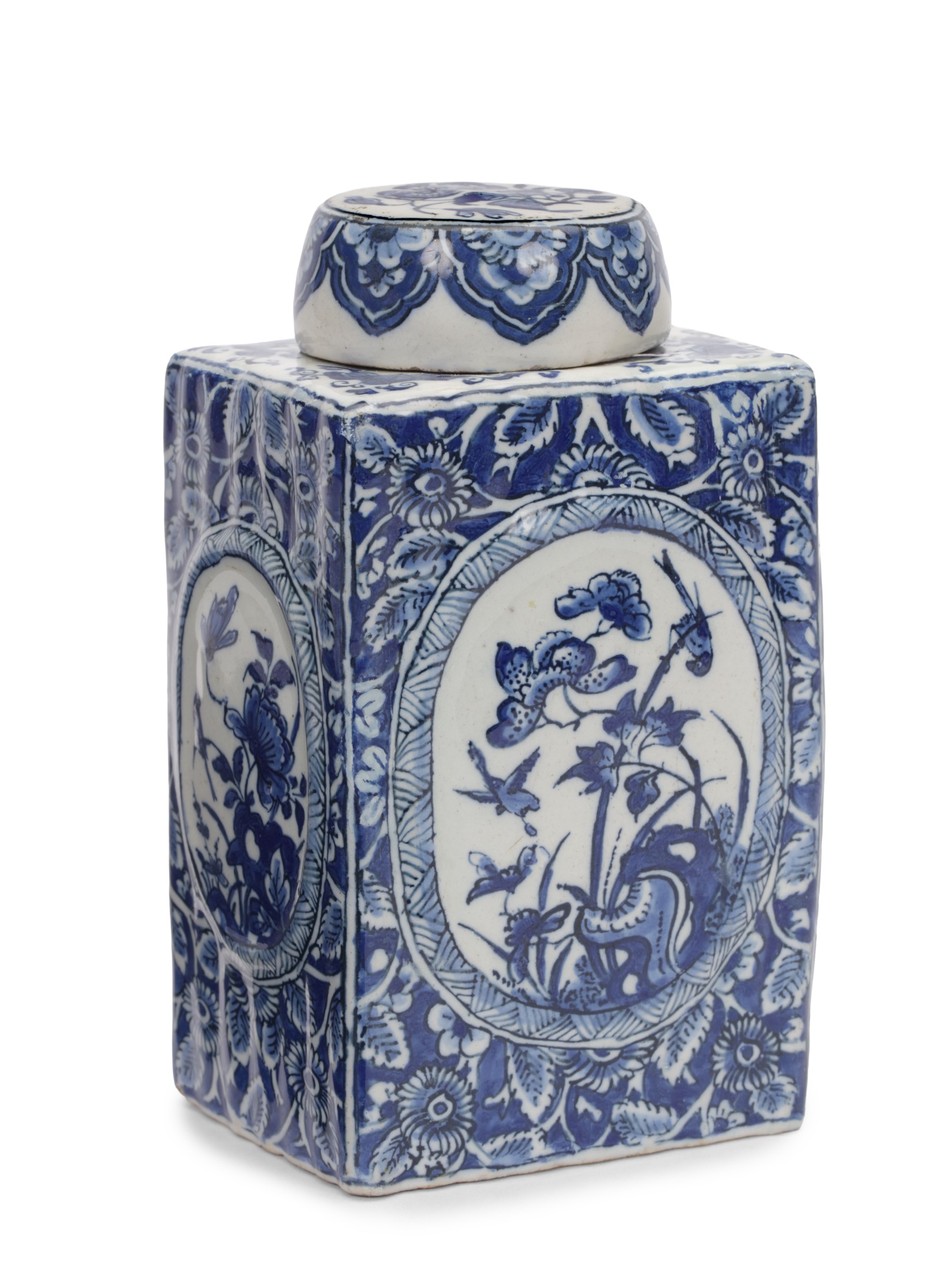 This tea canister is a refined example of early eighteenth-century Delftware, distinguished by its molded form, dense surface decoration, marked for Pieter Adriaensz. Kocks, owner of De Grieksche A (The Greek A) factory in Delft from 1701 until his death in 1703, and subsequently used by his widow, Johanna van der Heul, who managed the factory until 1722.