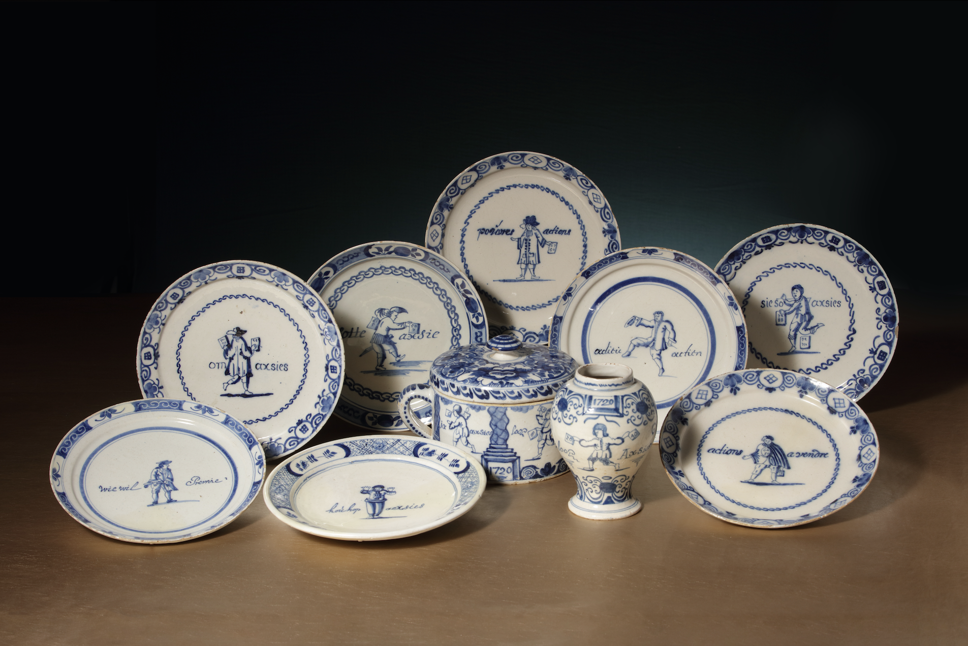 The present Delftware group, comprising a vase, a pot, and eight plates, belongs to this rare satirical tradition. By combining spirited imagery with pointed social commentary, these objects capture both the artistic ingenuity of Delft potters and the cultural impact of one of the most notorious financial crises of the early eighteenth century.