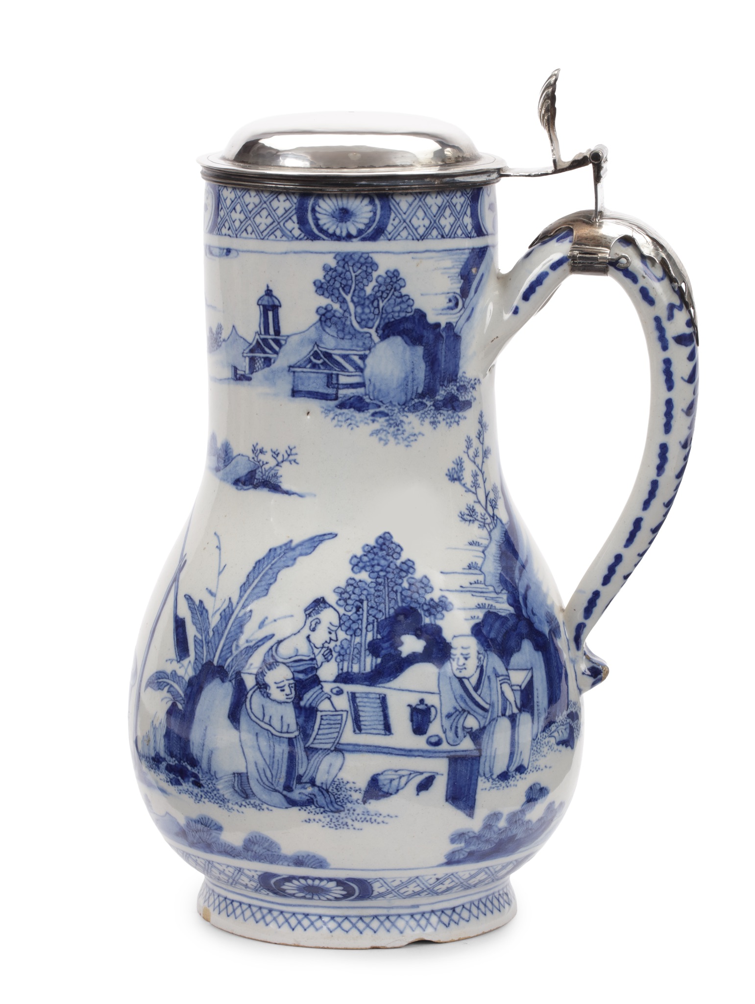 The form of the vessel is distinctly European, designed for the consumption of beer or wine, and demonstrates how Asian-inspired imagery was applied to Western shapes. The combination of a Delftware body with a silver mount underscores the object’s dual character: ceramic in origin, yet integrated into the material culture of early eighteenth-century Dutch interiors.