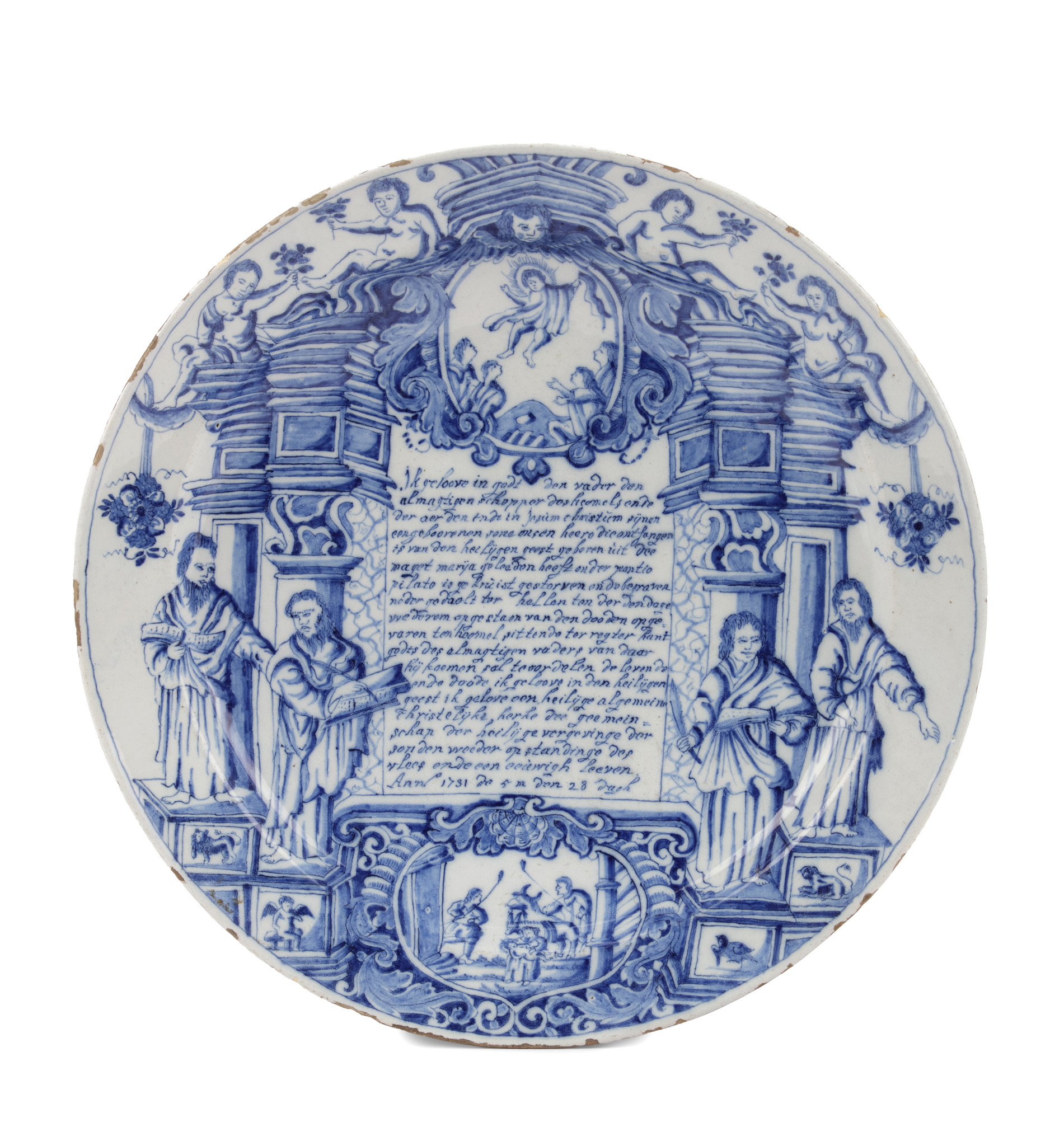 While earlier biblical chargers sometimes date to the late seventeenth century, the present charger, dated 1731, demonstrates the sustained popularity of the form into the early eighteenth century. The inscribed text, dated “Anno 1731 den 28 Juny,” likely represents a personal or communal statement of faith, consistent with a tradition in which such chargers served not only decorative but also devotional and commemorative functions.