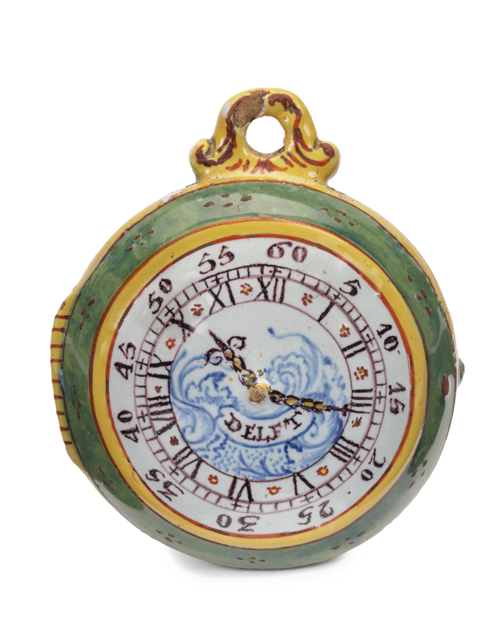 The decoration of this model underscores both its function and its fashion. The painted dial combines a minute ring of Arabic numerals with an inner chapter ring of Roman hours, punctuated by tiny florets, an accurate evocation of contemporary watch faces, while the two painted hands are set to about 10:16. At the center, a blue rococo scroll cartouche sweeps across the field around the word “DELFT,” announcing the place of manufacture and aligning the piece with local pride in Delftware production. The illusion continues in the casing: a green “case” with a yellow bezel, a molded hinge to one side and a winding “crown” to the other, a pierced back for ventilation, and a double-scroll suspension loop at the top. Together these details translate a fashionable personal accessory into a witty and decorative ceramic object: one designed not to keep time, but to complete the tableau of a domestic interior where Delftware and horology met on the mantel.