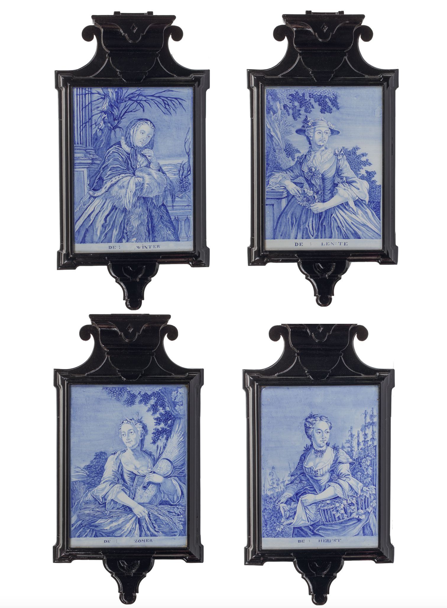 Within Delftware production, the theme of the Four Seasons enjoyed considerable popularity. In addition to plaques such as the present set, Delft potters produced allegorical figures and other decorative objects reflecting the same subject matter. These plaques thus illustrate how international artistic models, transmitted through prints and painting, were adapted into Delftware, reaffirming the enduring appeal of the Four Seasons as an allegory of time, nature, and human life.
