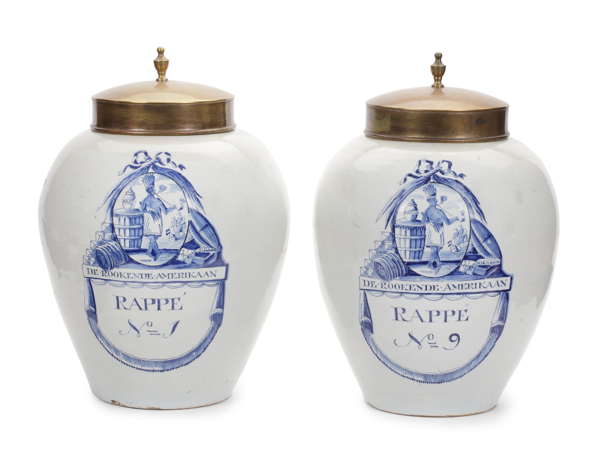 Each jar is painted on the front of the ovoid body with a Native American chieftain smoking a long-stemmed pipe beside a barrel, within an oval cartouche crowned with ribbon and bow, flanked by a stack of chests on one side and a boat on the other, and inscribed VOC Sigaren.