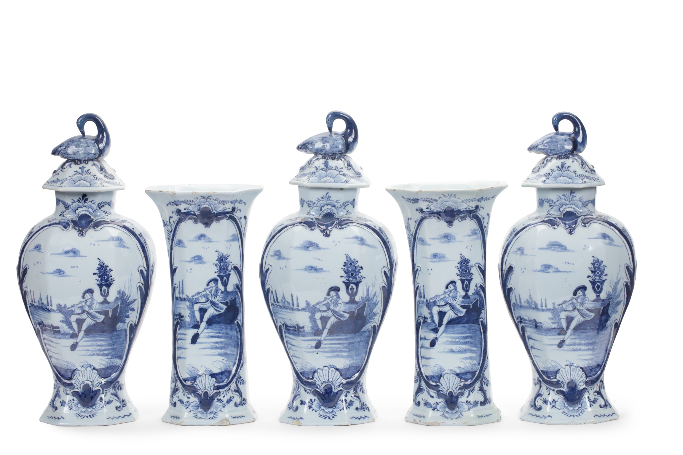 The present set belongs to this mature phase of Delftware garniture production, when potters increasingly drew on European artistic movements to shape both form and decoration. Its molded cartouches, enriched with shell motifs, and the overall sense of movement in the design are characteristic of the rococo style, which had become fashionable across Europe by the mid-eighteenth century. This style encouraged asymmetrical curves, playful ornament, and a shift from exotic chinoiserie subjects to pastoral and romantic European scenes. The swan finials, an unusual choice within the Delft tradition, complement the rococo taste for naturalistic and graceful forms, while distinguishing the set from more common finial types such as foo dogs or birds with cherries.