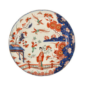 On this Delft plate, the Lange Lijs figure is holding both a lotus and an osmanthus spray, while a child beside her carries osmanthus sprays in both hands. This composition may reflect a fusion with Xia Ying, another celebrated female figure in Chinese culture. This elegant woman appears in the narrative Zhe gui ying xi (“Plucking Osmanthus, Children at Play”). The story tells of the scholar Zhang Hua, who met a fairy named Xia Ying, disguised as a woman with a child and holding an osmanthus spray. She promised to marry Zhang Hua if he passed the imperial exams. Motivated by her words, he succeeded, and she stayed true to them.¹⁰ The scene therefore expresses the wish that a child will grow up to succeed in the civil-service examinations and attain official rank.